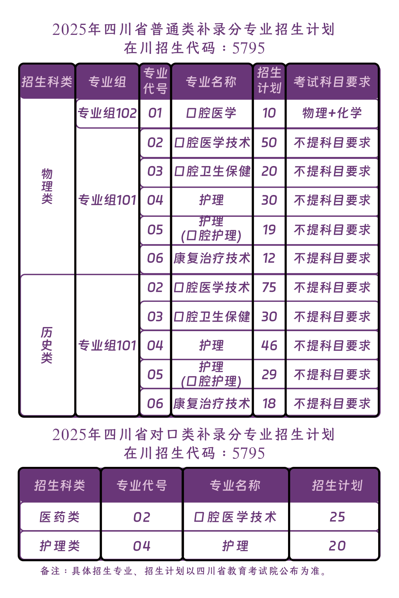 请符合四川省补录条件且有意就读我校的考生及时关注四川省教育考试院发布的普通专科补录工作相关通知,在补录志愿填报时将资阳口腔职业学院作为第一个志愿填报(即第一志愿01填报),增大录取几率。
