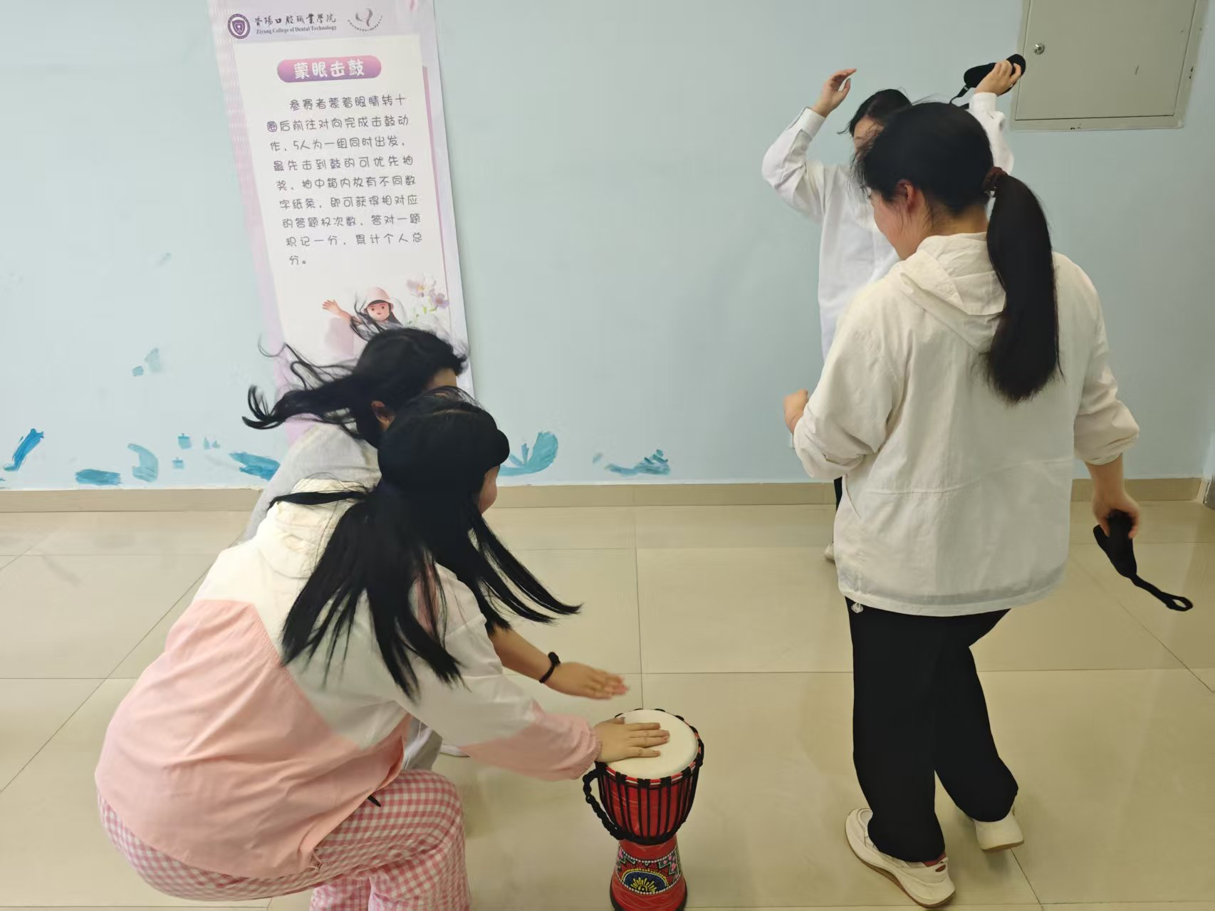 在初赛的“蒙眼击鼓”环节,参赛者蒙着眼睛转十圈后,朝着对面的鼓奔去,5人为一组同时出发。现场气氛紧张又欢乐,选手们在转圈后晕头转向,却依然凭借记忆和感觉努力冲向目标。最先击到鼓的选手可优先抽奖,抽中不同数字纸条就能获得相应的答题权次数,答对一题积10分,累计个人总分。这一环节不仅考验了选手们的方向感和平衡能力,也让大家在紧张刺激的氛围中巩固了心理健康知识。