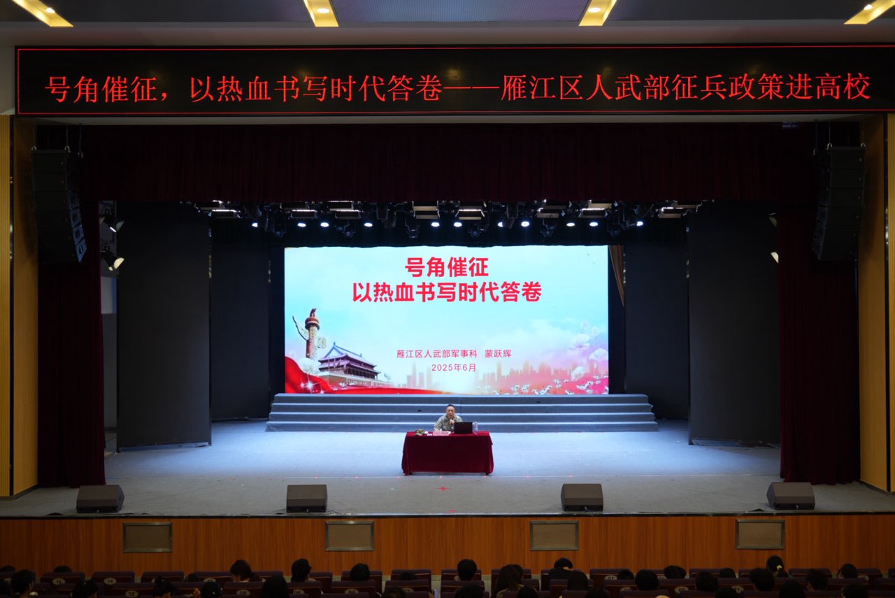 为精准对接国防需求,输送高素质技能兵员,6月6日,学院携手雁江区人民武装部,在学院学生活动中心成功举办“号角催征——以热血书写时代答卷”征兵政策进高校专题讲座。活动深度融合政策宣讲与榜样引领,为学子们献上了一份翔实的“参军指南”。