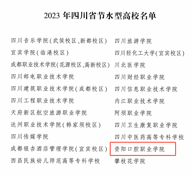 近日,四川省水利厅、教育厅、机关事务管理局印发《关于公布2023年节水型学校名单的通知》(川水函[2023]1823 号),学院通过申报和验收达到省级节水型高校建设标准,被授予“节水型高校”荣誉称号。