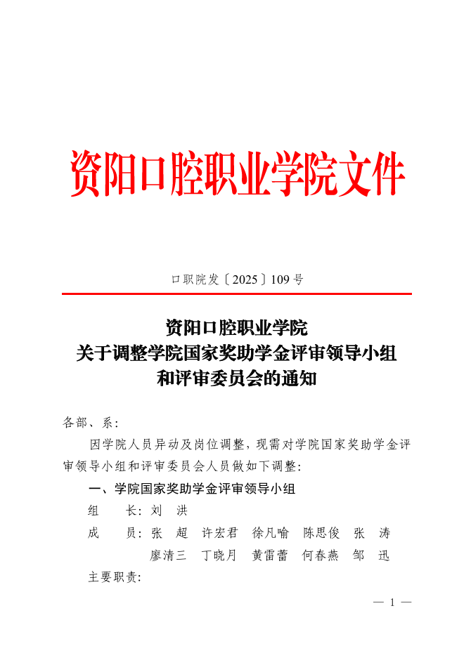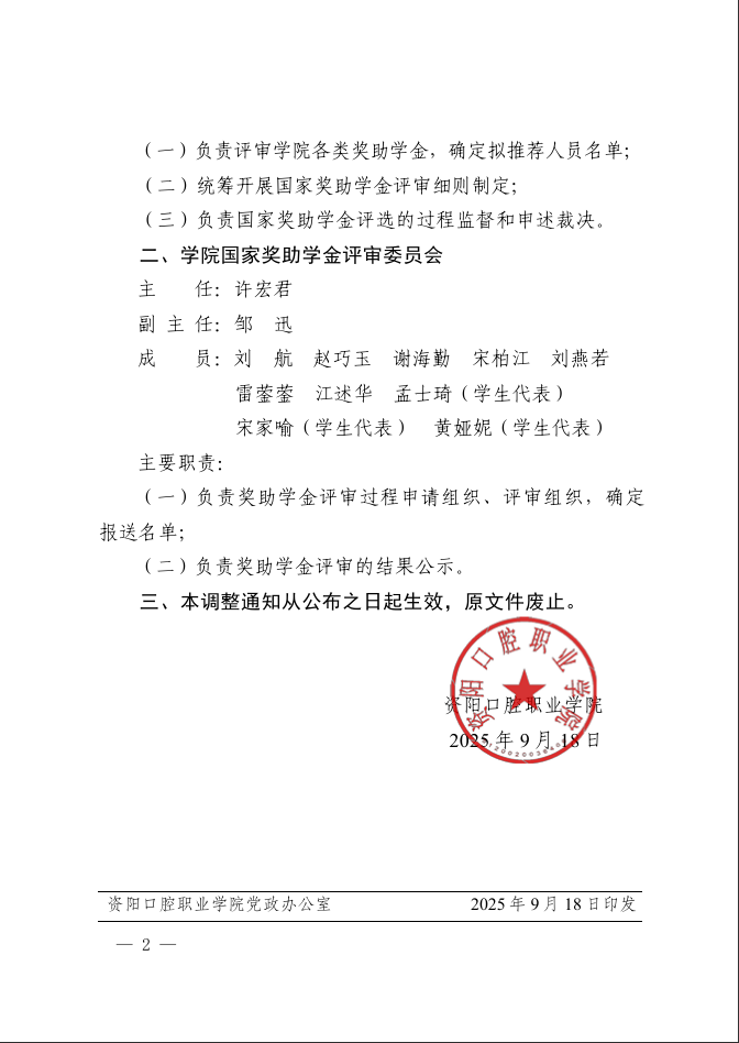 资阳口腔职业学院关于调整学院国家奖助学金评审领导小组 和评审委员会的通知