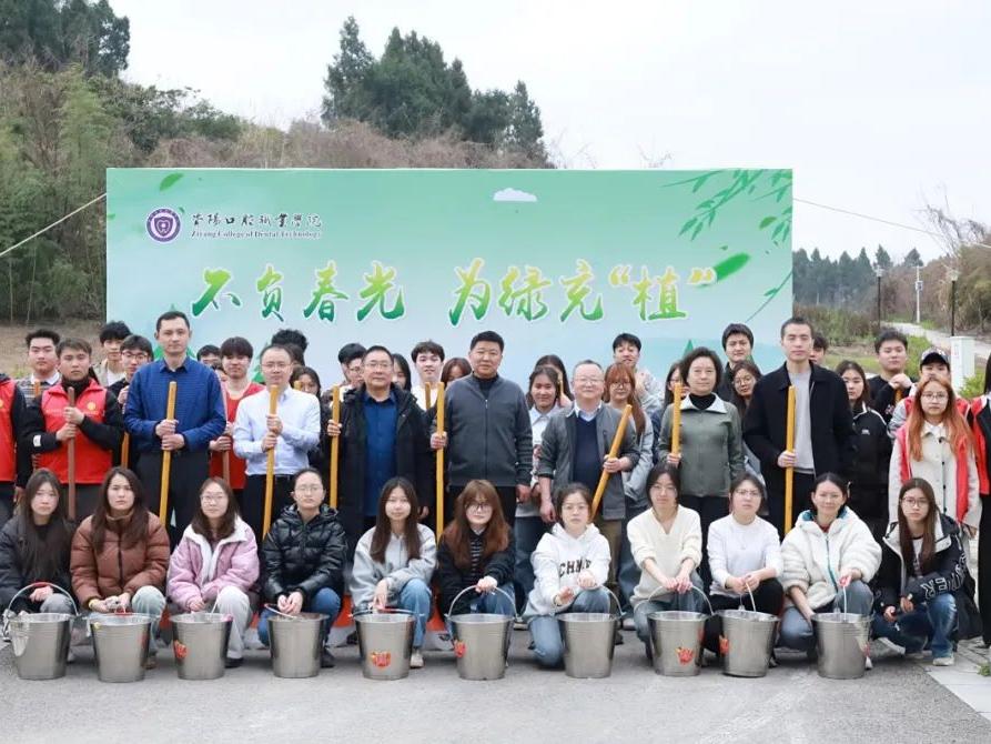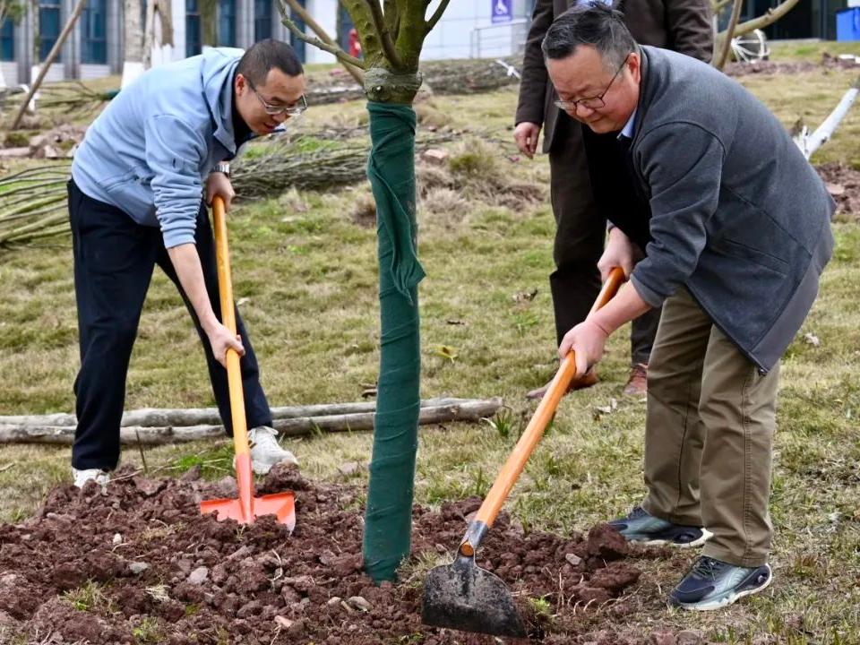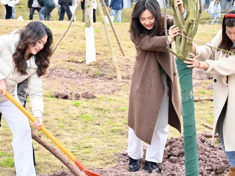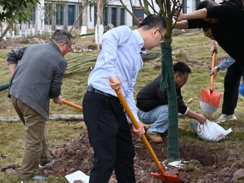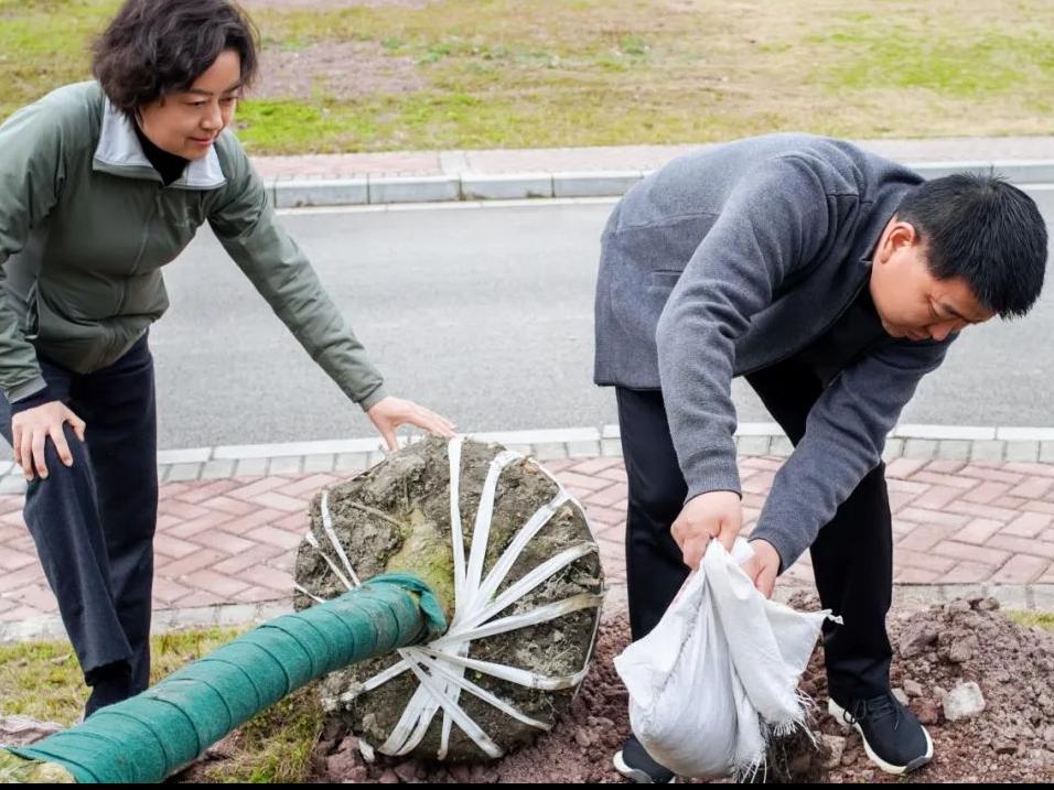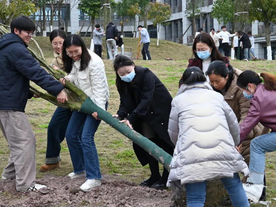 春光作序之际,口职院植树节化身绿色实践课堂。校领导带头示范挥锹破土,青年教师与学生搭档扶正树苗,后勤人员穿梭保障水源供应。