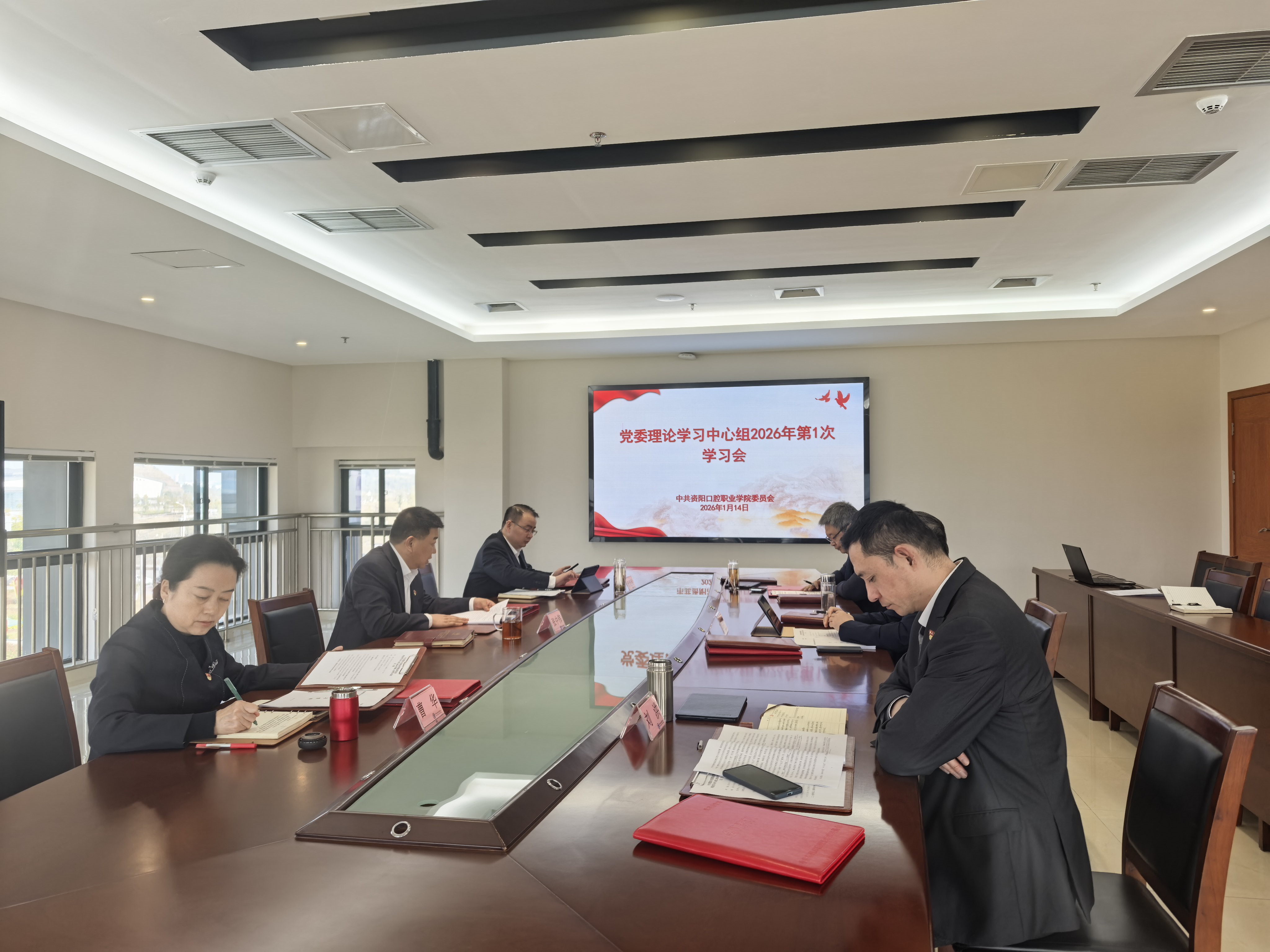 1月14日,资阳口腔职业学院党委理论学习中心组召开2026年第1次学习会,开展2025年度民主生活会会前专题学习,深入学习《中国共产党章程》、习近平总书记关于党的建设的重要思想、关于党的自我革命的重要思想、关于作风建设的重要论述,重点学习贯彻习近平总书记在中央政治局民主生活会上的重要讲话精神,为开好2025年度民主生活会打牢思想基础。学院党委书记、理事长张中伟主持会议,学院领导班子成员参会并围绕学习主题开展研讨。