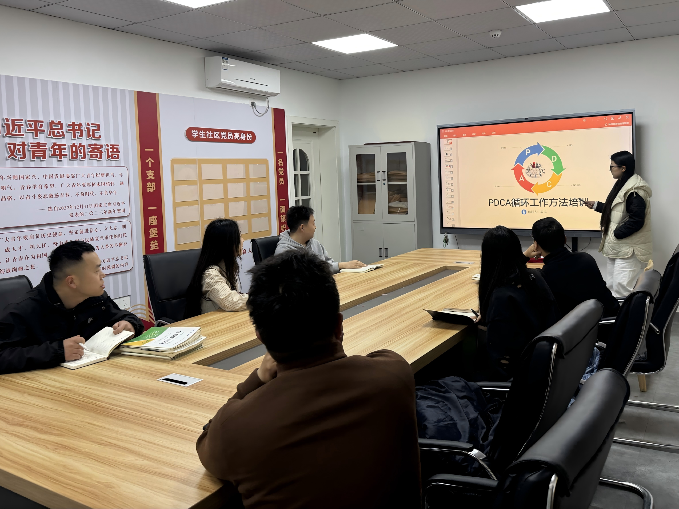 2026年3月11日,学生工作部学工四组于学生公寓四栋辅导员工作站开展PDCA循环工作方法专题培训。本次培训旨在推进学生工作标准化、规范化、精细化建设,提升学工队伍的科学管理能力与岗位实践质效。培训由晏端主讲,学工四组全体辅导员参与,是一堂立足学生管理与服务实际、聚焦核心能力构建的管理工具研习课。