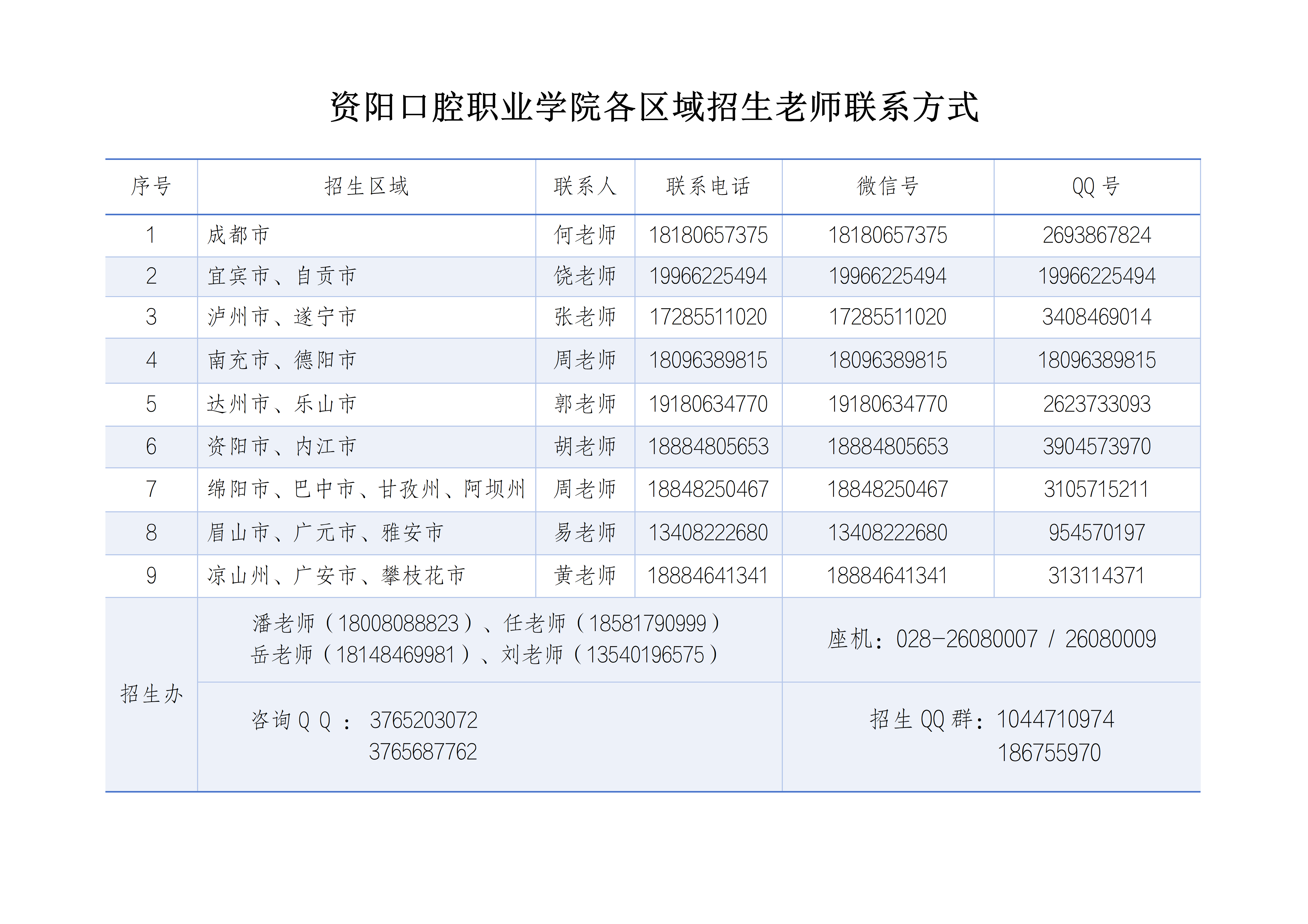 资阳口腔职业学院各区域招生老师联系方式