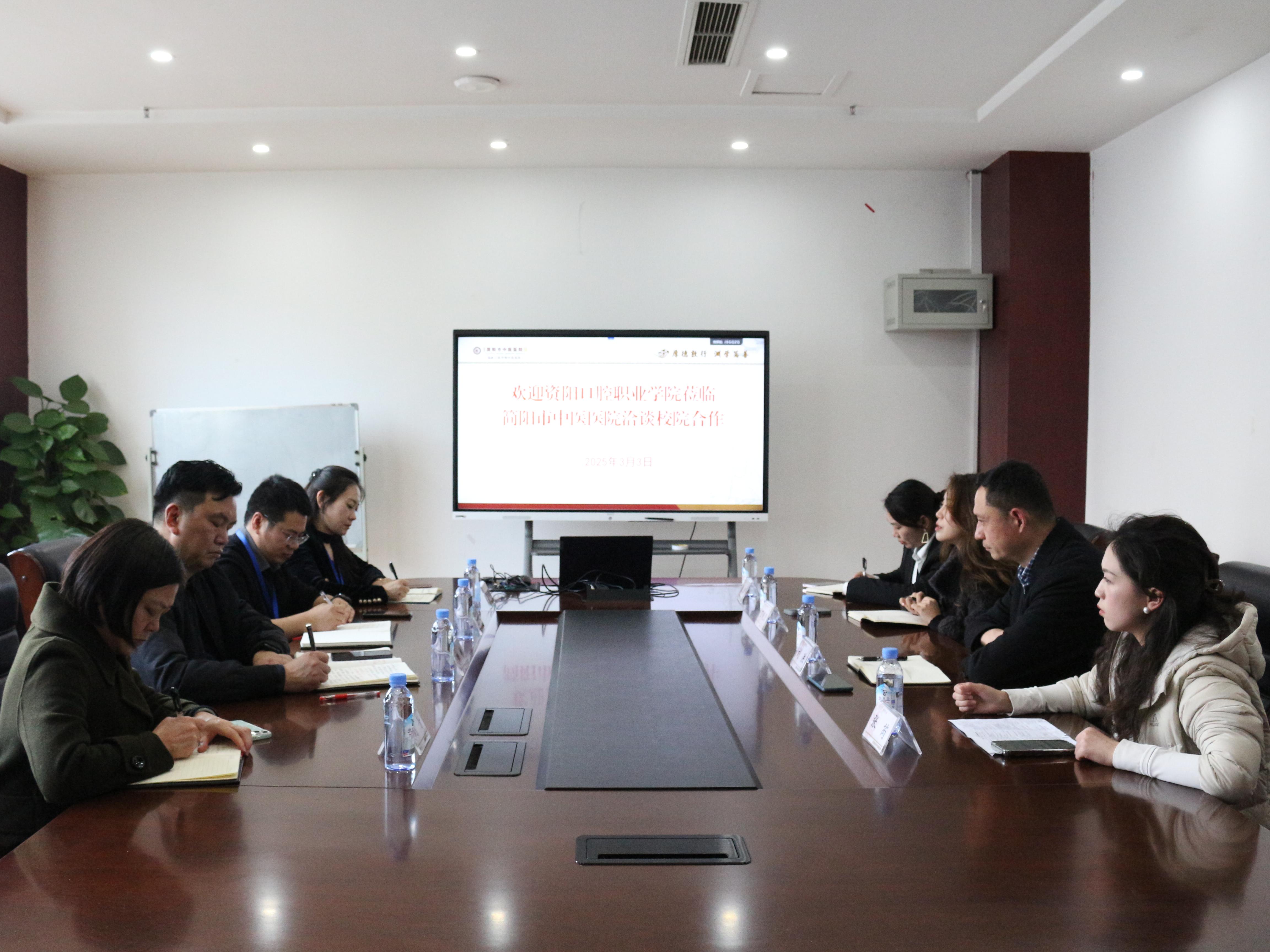 为深化产教融合、推进校院协同育人,3月3日,资阳口腔职业学院副院长刘洪一行赴简阳市中医医院开展“访企托岗促就业”专项行动,双方就共建护理、康复专业“师徒制”及理论班合作事宜展开深度洽谈。简阳市中医医院副院长田彬及相关部门负责人出席座谈会。
