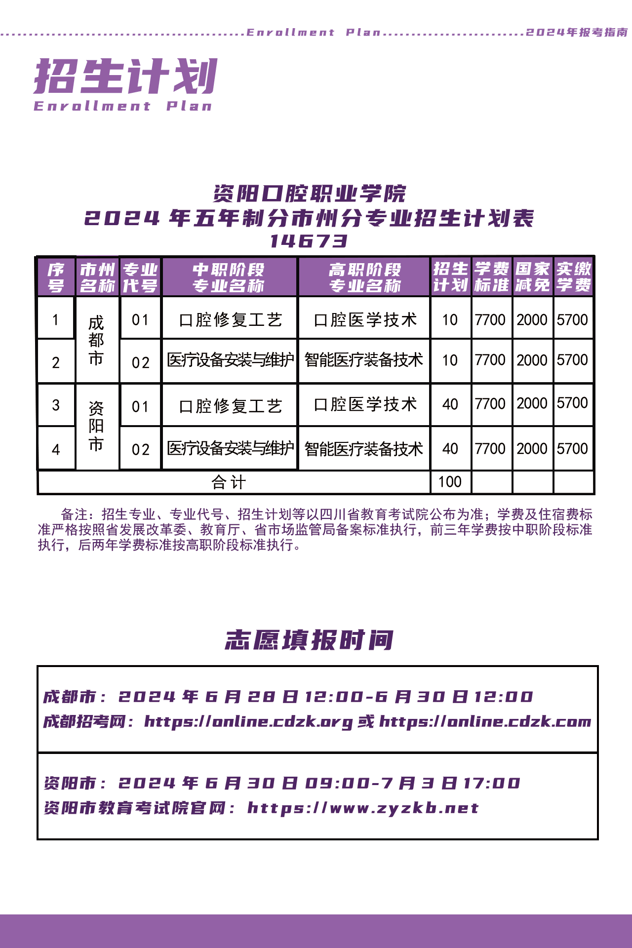 资阳口腔职业学院2024年五年制分市州分专业招生计划