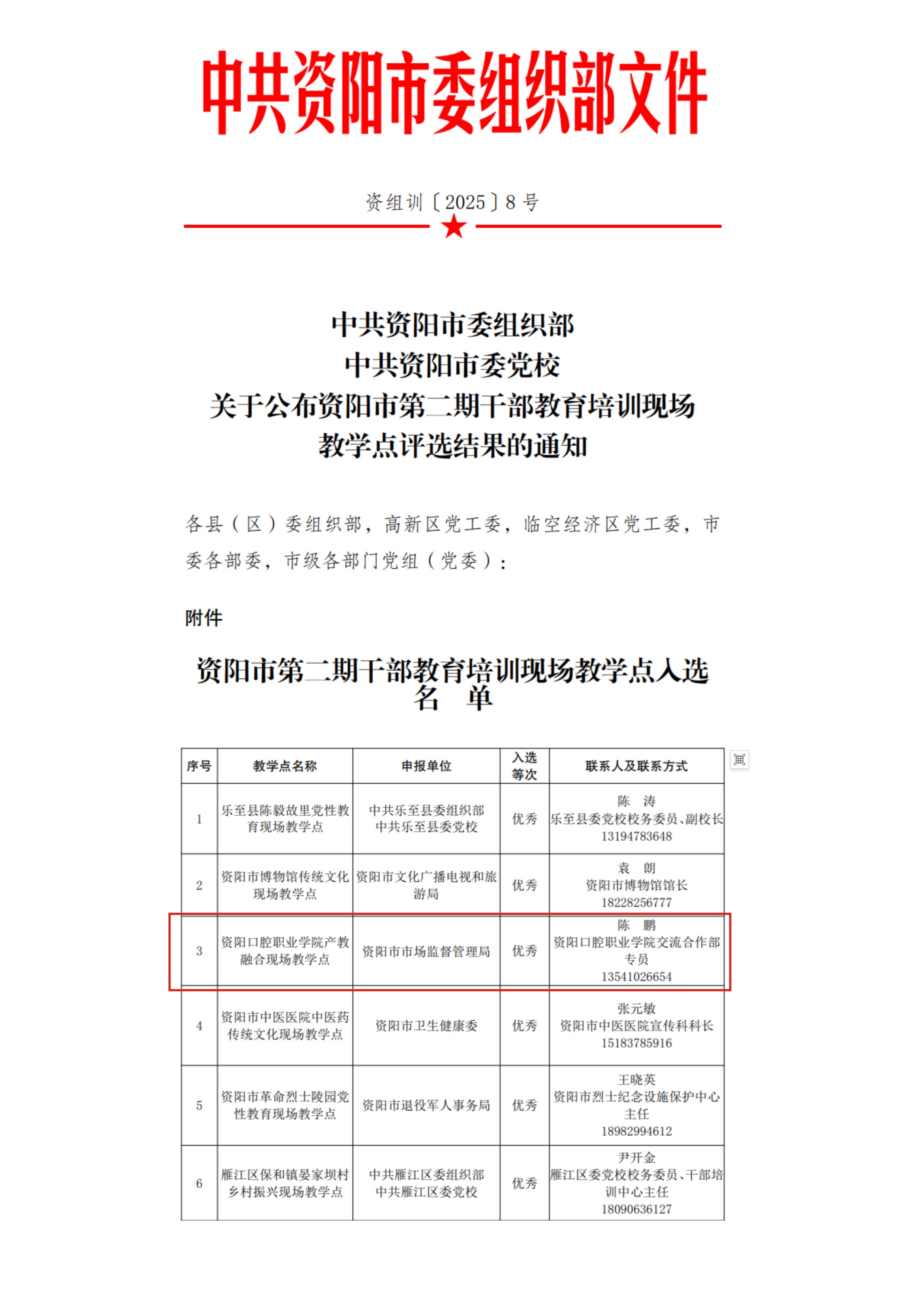 近日,中共资阳市委组织部、市委党校联合公布了资阳市第二期干部教育培训现场教学点评选结果。经过组织推荐、专家评审和线上公示等严格程序,资阳口腔职业学院申报的“产教融合现场教学点”从全市49个参评单位中脱颖而出,荣获“优秀”等次,成为本批次14个市级优秀教学点之一。